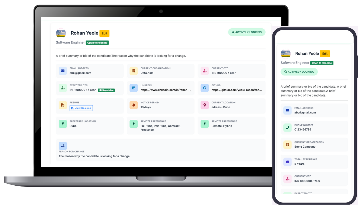 The Universal Profile Generator transforms any resume into a single shareable hiring link that replaces the traditional screening call. Recruiters get verified skills, experience, compensation expectations, notice period, and structured technical answers β all upfront and in one place. No scheduling delays. No repetitive form fills. Just instant clarity, faster qualification, and candidates who move directly to meaningful evaluation.